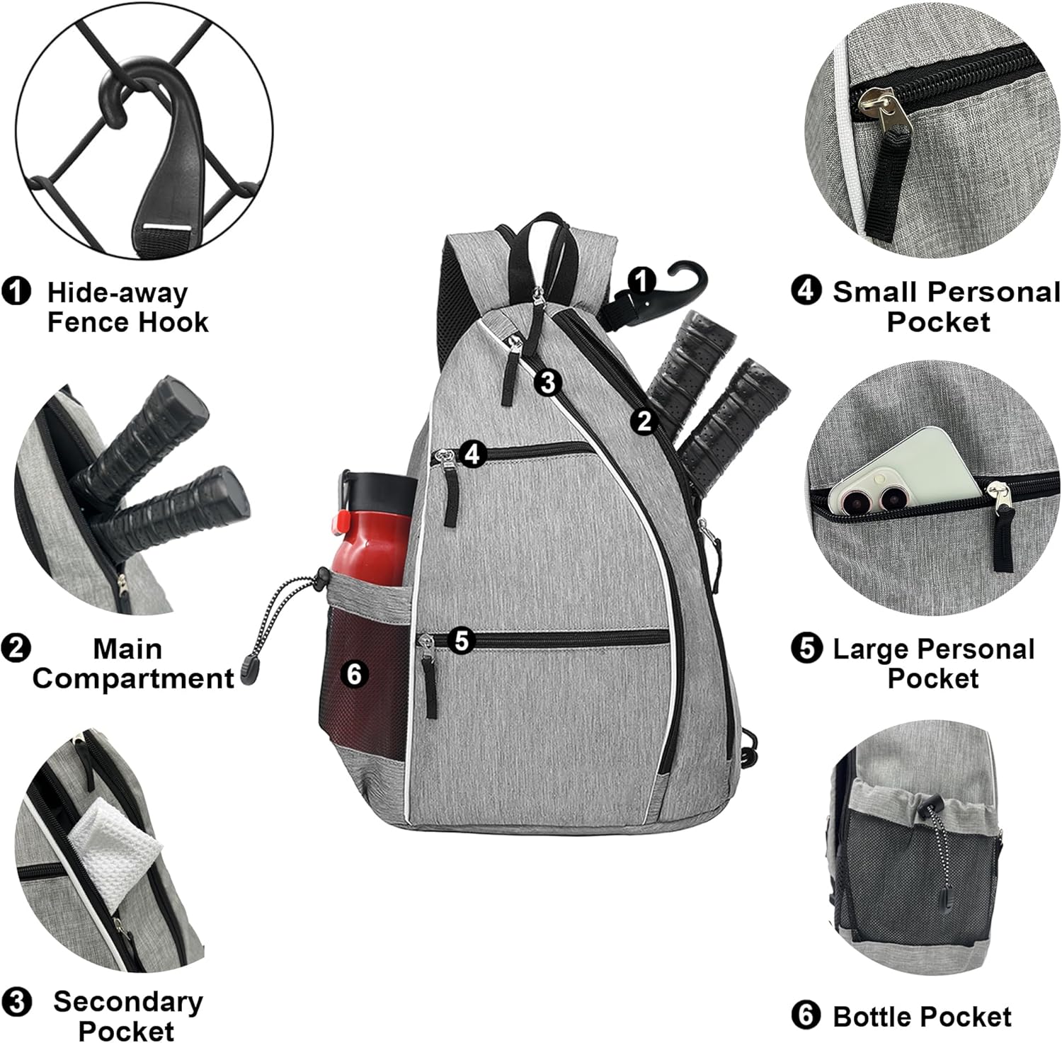 TONS OF POCKETS TO FIT EVERYTHING,Our sling bags feature 5 pockets and external water bottle holder. Main compartment can hold up to 6 pickleball paddles, 2 tennis or raquetball rackets, or up to a 15 inch laptop.